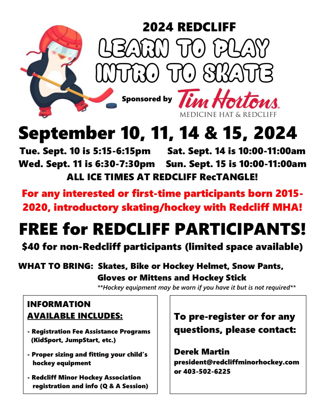 Please email registrar@redcliffminorhockey.com to register. It’s open to all new players, please share it if you know anyone interested to learn to play hockey!!